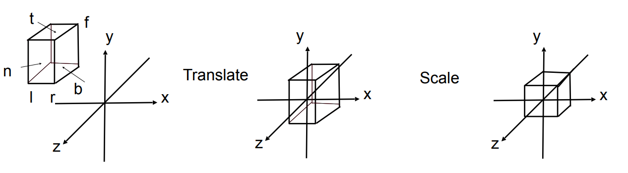這種投影方式比較容易實現,簡單來說就是將攝像機放到原點,看向 $-z$。然後將看到的所有東西的 $z$ 座標丟棄,並將所有東西縮放到 $[-1,1]^{2}$ 之間。