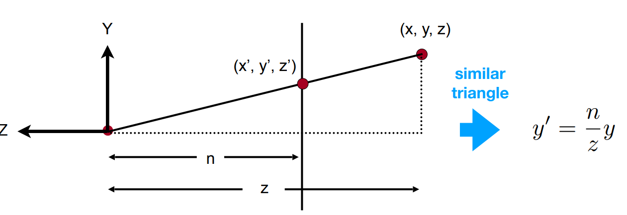 通過三角形相似,我們就可以得到結論 $y’=\frac{n}{z}y$ 且 $x’=\frac{n}{z}x$。