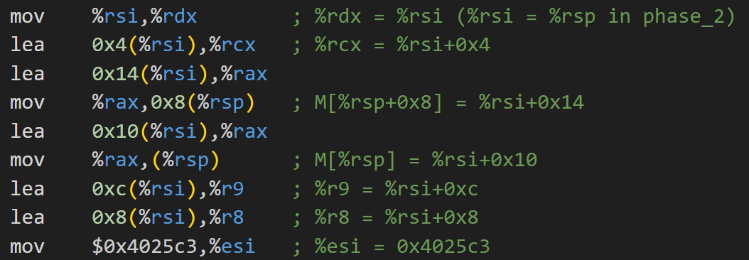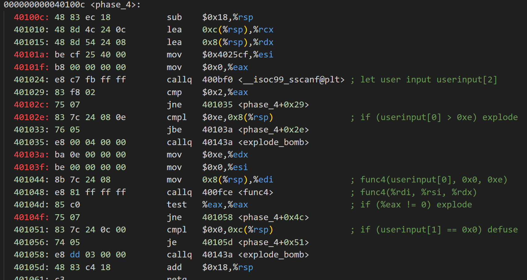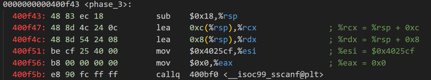 透過觀察0x400f47與0x400f4c處的lea指令發現將用戶輸入讀入%rsp+0x8與%rsp+0xc處。為更好理解,我們假設%rsp+0x8與%rsp+0xc為一個數組userinput[2],%rsp+0x8為userinput[0],%rsp+0xc為userinput[1]。