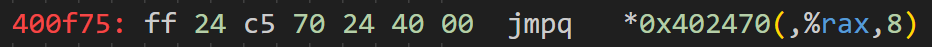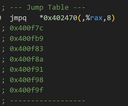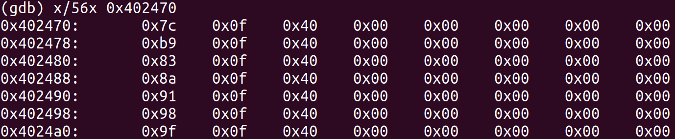 特別注意0x400f75處的代碼,發現其為switch指令的跳轉表,跳轉的公式即:<基地址> + <寄存器值> * <表項類型大小>。查看0x402470中的值,即跳轉表的基地址。由0x400f6a處的判斷可以推測該跳轉表大小應為7項,因為跳轉表儲存的值佔8字節,所以跳轉表所佔的字節大小為$7 \times 8 = 56$字節。
