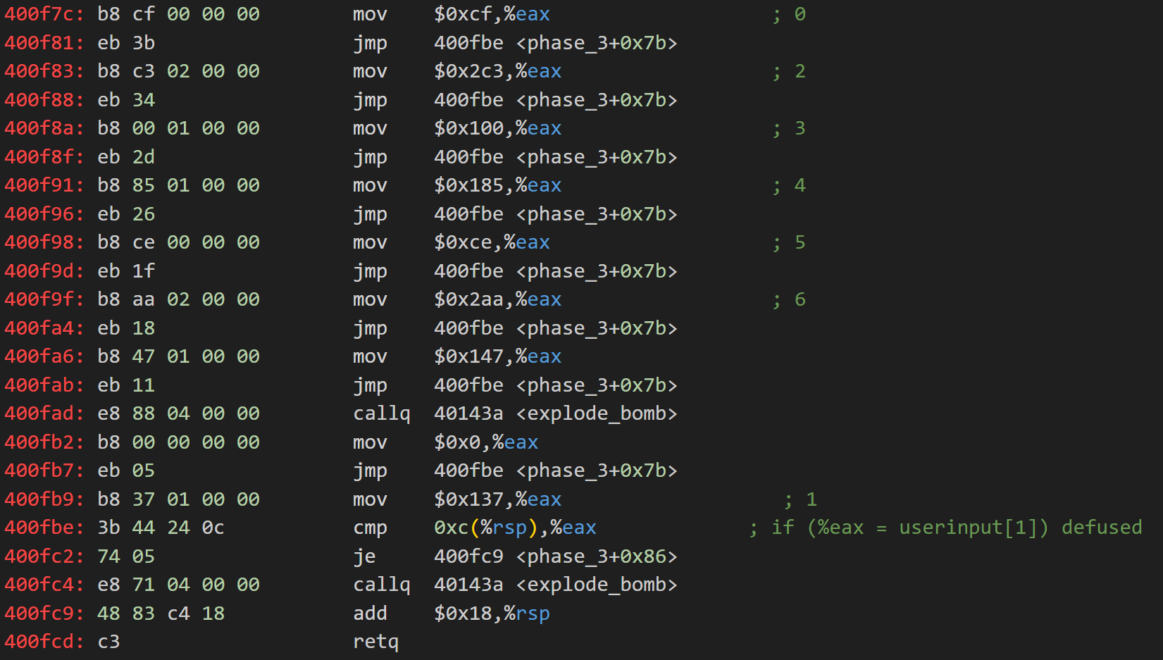 觀察phase_3剩餘代碼,在跳轉表跳轉到的地址處,我標註了跳轉過來對應的userinput[0]值。我們可以看到在每個跳轉後代碼都會給%eax賦予一個特定的值。