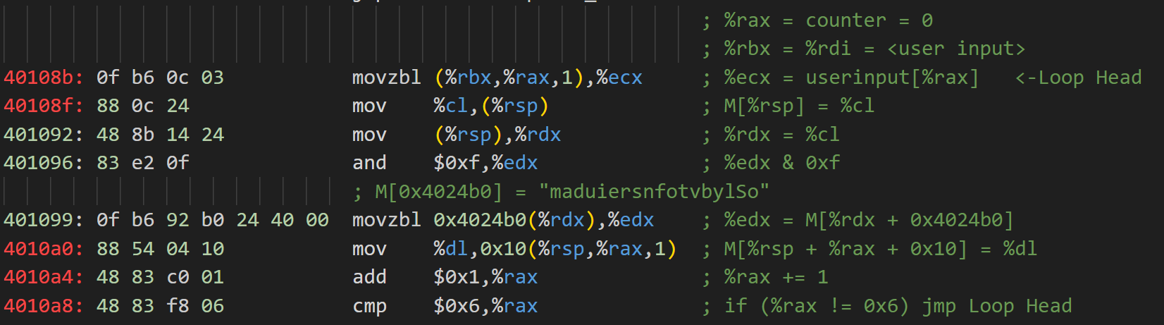 接下來是重中之重,分析代碼中的循環,即0x40108b~0x4010a8處的代碼。