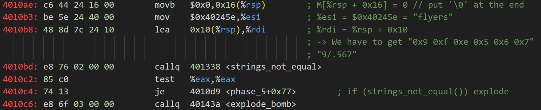 觀察0x4010ae~0x4010bd處代碼,我們可以發現strings_not_equal調用的兩個參數分別是處理後的用戶輸入M[%rsp+0x10]與硬性寫入的內存地址0x40245e。查看0x40245e存放的內容。