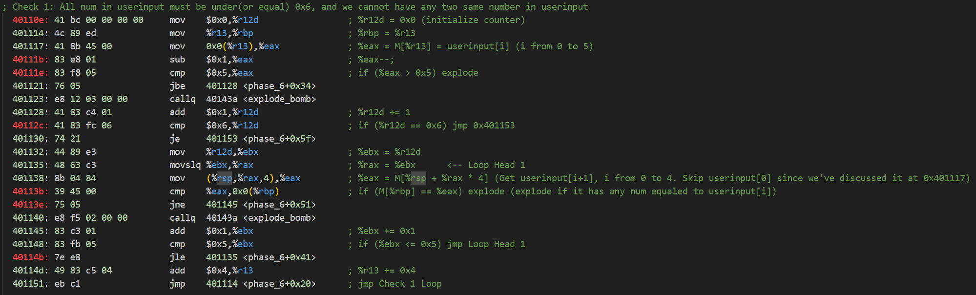 觀察代碼,我們可以看到0x40110e~0x401151是一個以%r12d為計數器的大循環(Check 1 Loop)。在這個大循環裡面,還套嵌著另一層循環0x401135~0x401148(Loop 1)。