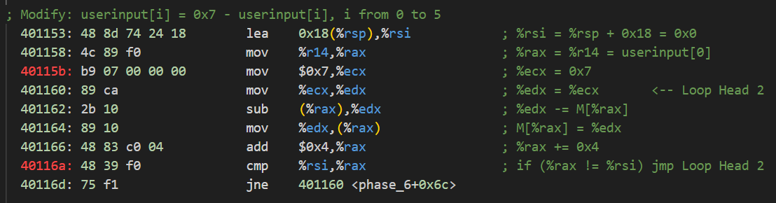 仔細觀察循環,發現%eax讀取-0x4(%rbx)中的值。因為int類型占4字節,所以若%rbx指向用戶輸入的第i個數,M[%rbx - 0x4]會讀取用戶輸入的第i - 1個數。同時,因為執行add指令比執行mul指令速度快,所以程序使用add指令優化%eax *= 2。