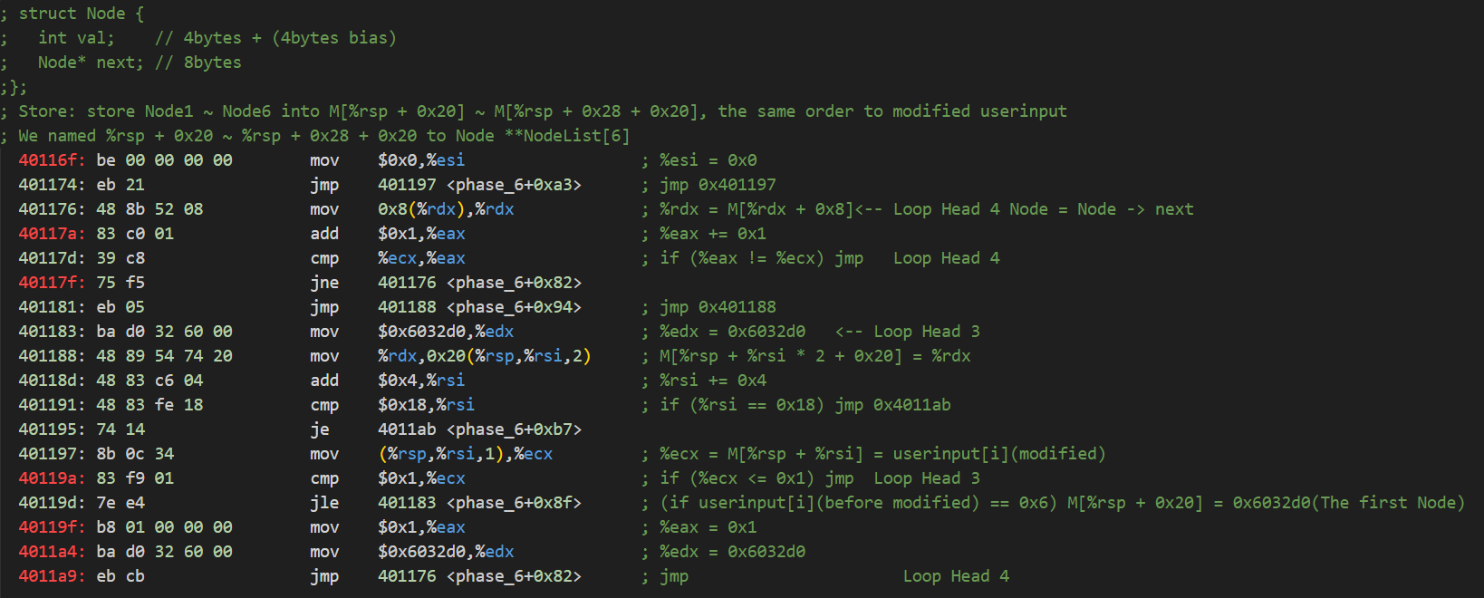 1 | // 令%rsp+0x20 ~ %rsp+0x48為指向鏈表的指針,即:Node **NodeList[6] |