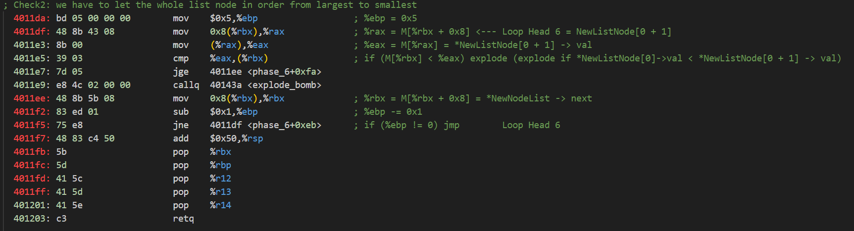 Loop 6的功能是取得每個節點的值,並檢驗鏈表是否依節點的值由大排到小。與以下C++代碼功能相等