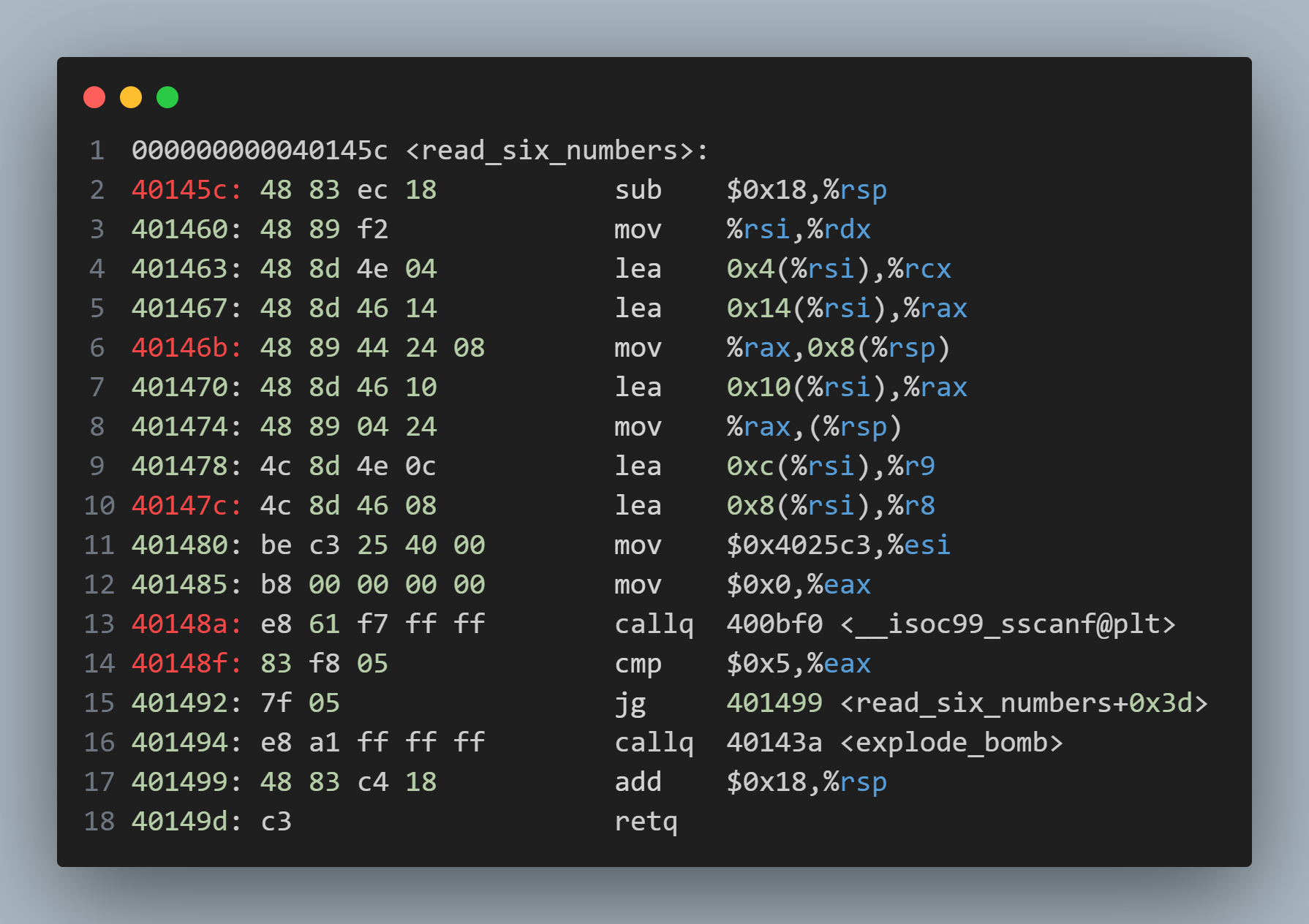 首先0x400f0a檢查(%rsp)是否為0x1,如果不等則直接爆炸。由0x400f02處的代碼可知%rsp = %rsi,且在函數read_six_numbers中%rsi = %rdx,所以(%rsp)中的值就是用戶輸入的第一個數字(即檢查用戶輸入的第一個數字是否等於1)。