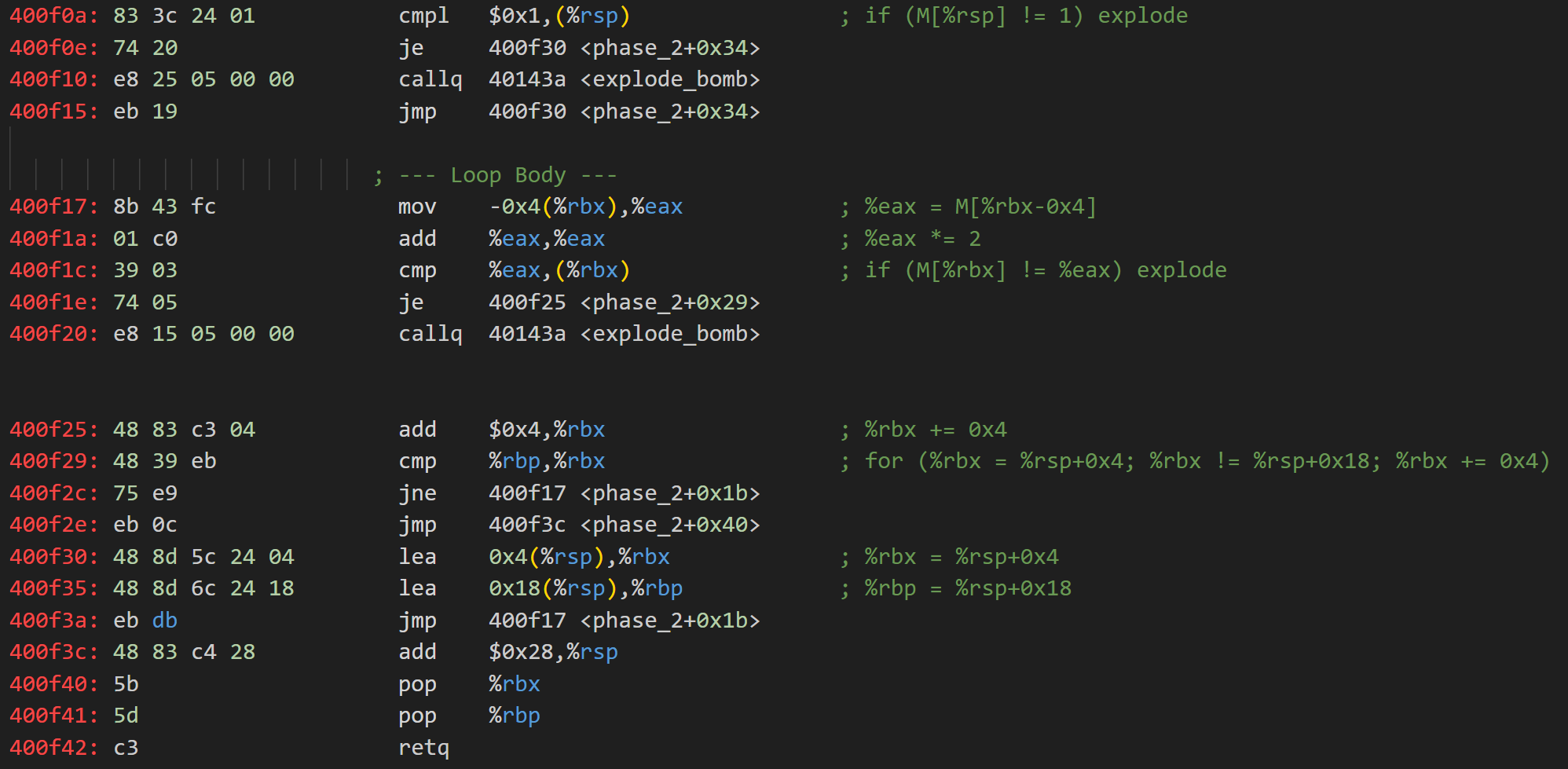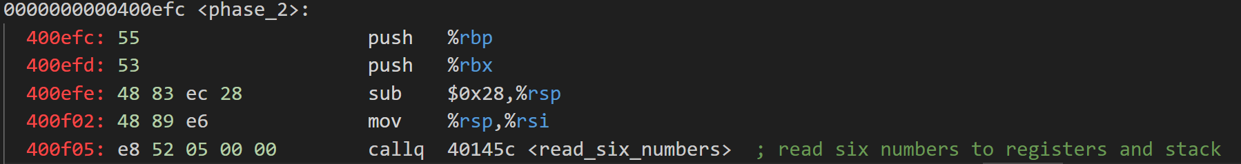 如果通過該檢查,則跳轉到0x400f30處,初始化%rbx與%rbp。通過觀察,可以發現0x400f17~0x400f2c是一個for循環。