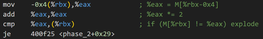 最後兩條指令比對%eax與(%rbx)的值,若是不相等則爆炸。由此我們可以構造出一個長度為6的數組,首項為1,其後每一項都是前一項的兩倍。