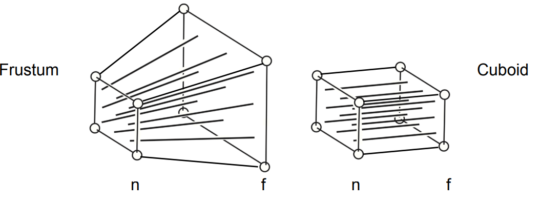 - Projection transformation:將攝像機空間中的視錐體映射到標準裁減空間。